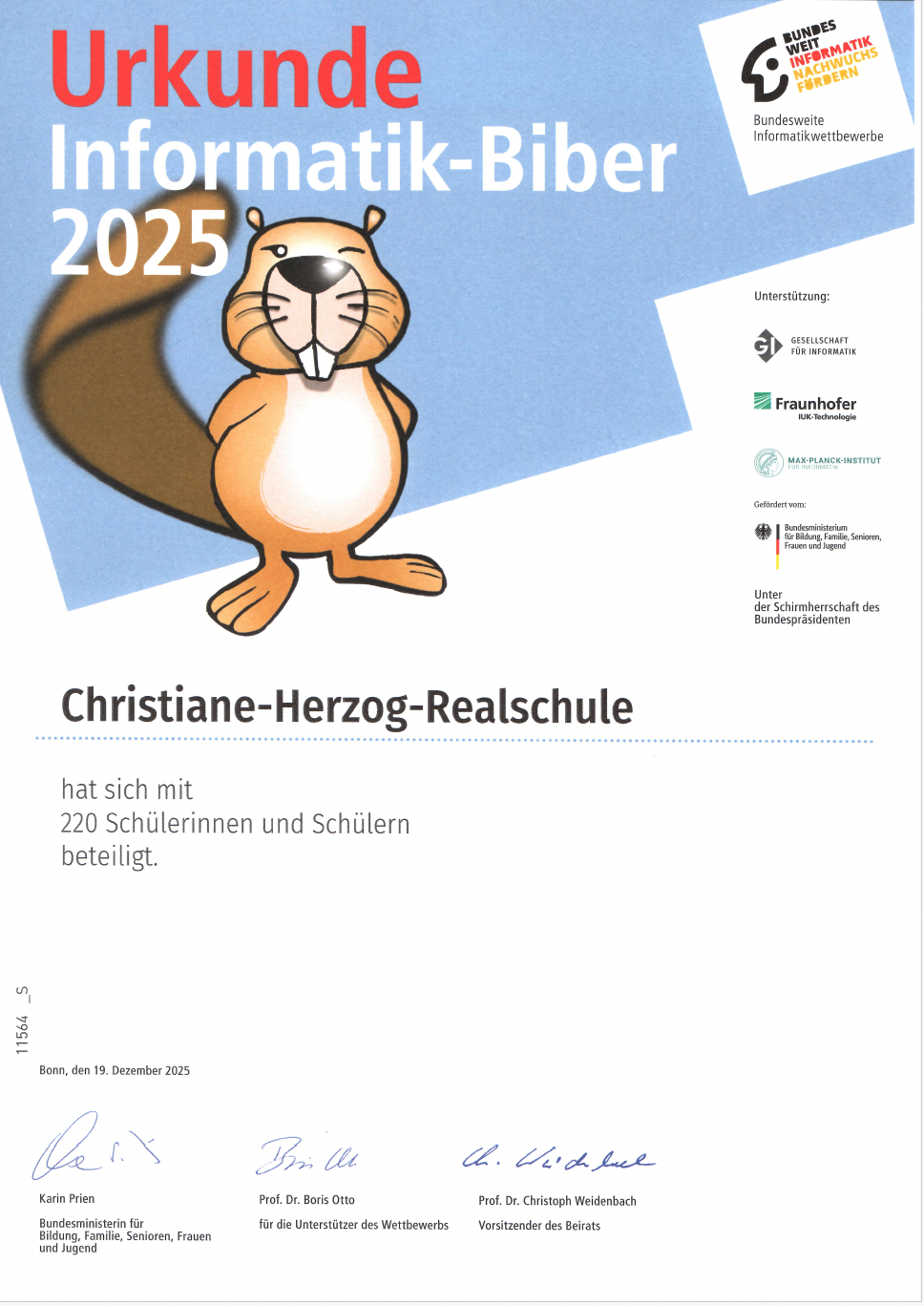 Große Beteiligung und viel Begeisterung für Informatik: In diesem Schuljahr nahmen 220 Schülerinnen und Schüler unserer Schule am bundesweiten Wettbewerb Informatik-Biber teil. Mit spannenden und abwechslungsreichen Aufgaben regt der Wettbewerb dazu an, logisch zu denken, kreative Lösungswege zu finden und einen Einblick in die Welt der Informatik zu gewinnen.