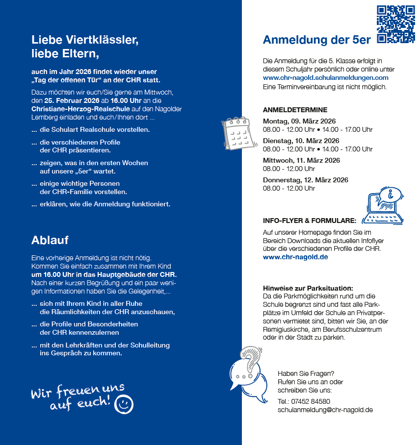 Schulleitung, Lehrkräfte, sowie Schülerinnen und Schüler stellen Ihnen an diesem Tag die Angebote und die Räumlichkeiten der CHR vor.